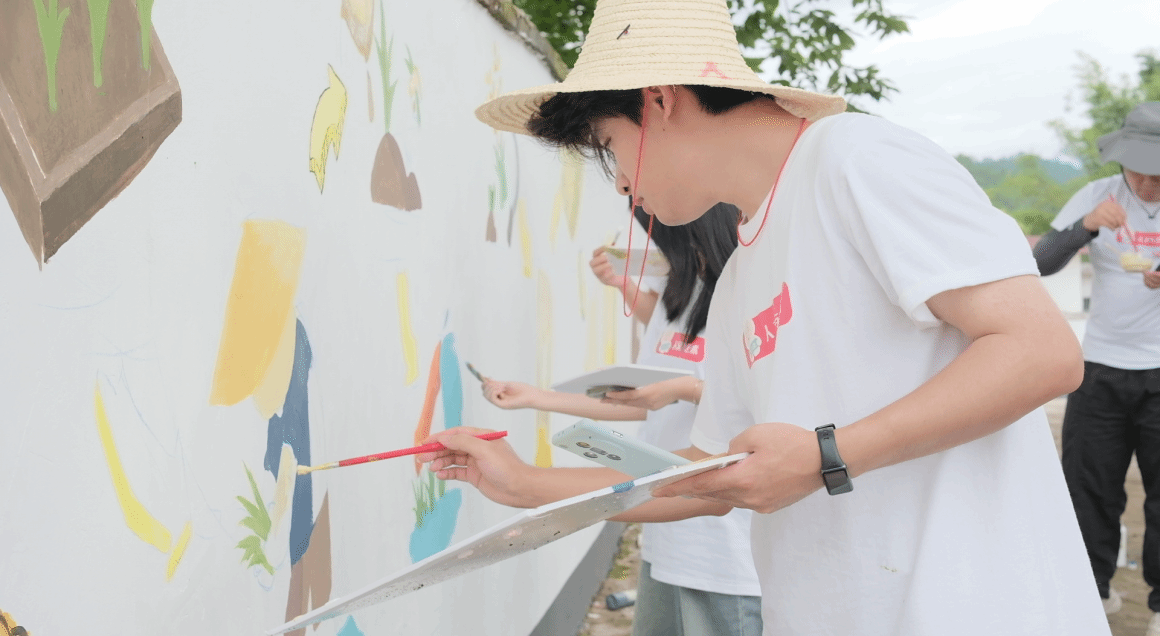 “既要画得像,更要传得远。”实践团成员发挥专业特长,先根据调研内容完成电子稿设计,再带着颜料、画笔,在洁白的墙面上一步步起形、描边、上色。烈日下,成员分工协作,有的调和颜料确保色彩鲜活,有的精细勾线还原细节,经过数天忙碌,一面面普通的墙面变成了长达百米的“文化画卷”,丰收的稻田、飘香的酒缸、忙碌的农人跃然墙上,成了村里最亮眼的风景线。