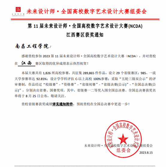 近日,第11届未来设计师·全国高校数字艺术设计大赛(NCDA)省赛、国赛奖项公布,公司参赛作品喜获省赛一等奖5项、二等奖9项、三等奖10项以及国赛一等奖1项、二等奖1项的佳绩。