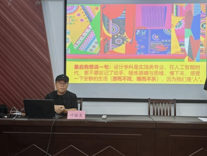 讲座中,叶佑天教授结合自己大量的作品,以中国传统“柔性表达”哲学为理论根基,借“水”的“柔弱胜刚强”“无为而无不为”隐喻,拆解艺术突围的可行路径。深入剖析AI时代艺术创作的五大关键命题:以“人工干预”破解AI算法导致的文化符号扁平化,用传统“留白”智慧消解数字技术“视觉轰炸”,将线条韵律、意境营造等传统“柔性”基因转化为数字语言,以“慢”“静”“深”的节奏对抗碎片化焦虑,凭文化内涵赋予作品持久生命力。他指出AI对艺术设计的影响并非简单的“替代”,而是推动行业从“技术辅助创作”向“生态重构”的深层演进。在这场变革中,技术是效率工具,而人类的审美判断、文化理解与落地智慧,仍是定义设计价值的核心所在。