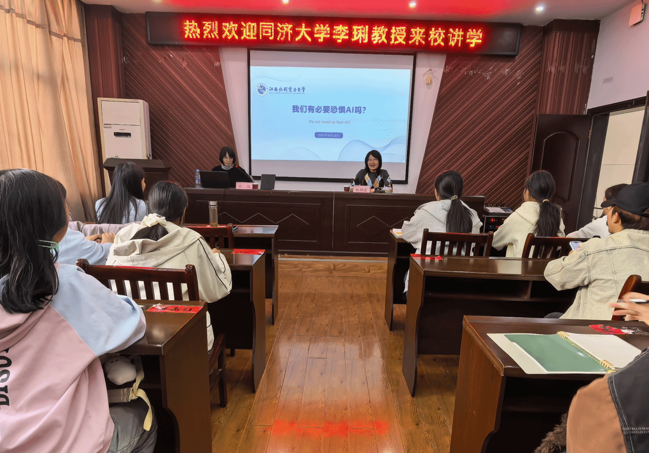 李琍教授以清晰的逻辑、通俗的语言,既解答了师生们对 AI 时代的困惑,也引导大家重新审视工作、社交与精神追求的意义。(文 董萌/图 袁雅思)