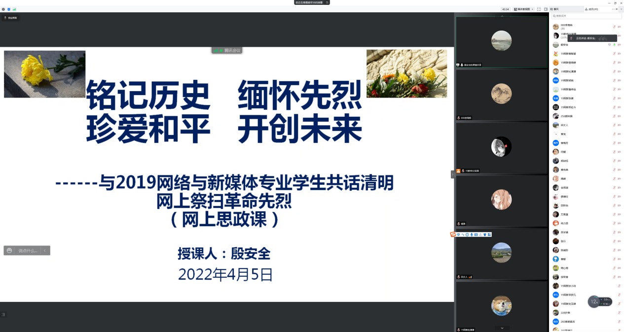 4月5日下午,校纪委书记殷安全通过腾讯会议为PA视讯官网师生上了一堂“铭记历史缅怀先烈 珍爱和平开创未来”清明节线上祭扫革命先烈思政课,公司党委书记熊华林等四位老师和19网络与新媒体专业全体同学参加本次课程。
