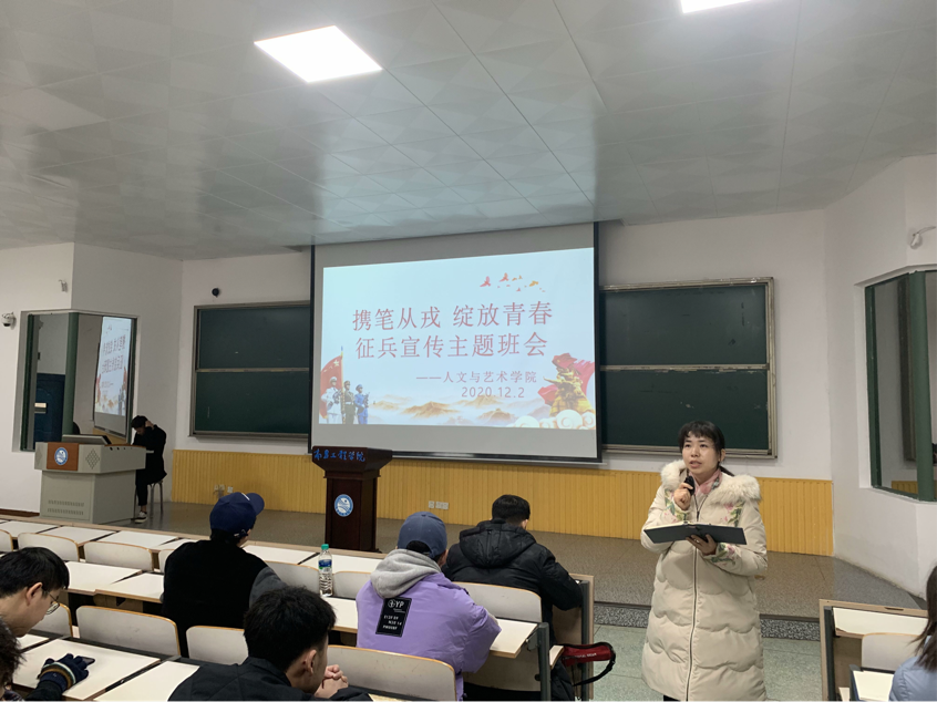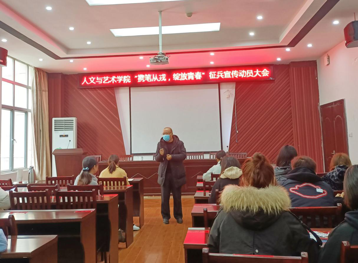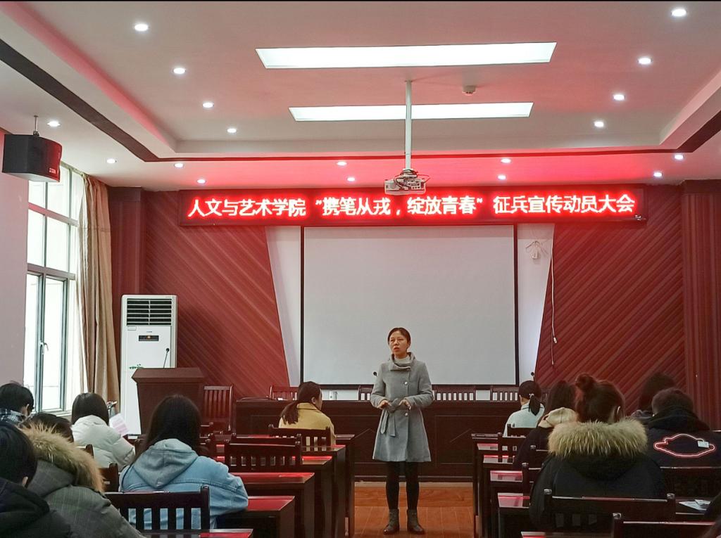 为提升公司员工军事素养,鼓励其积极应征入伍,努力提高兵员征集质量,推进国防和军队现代化建设,12月3日在教学南楼C105教室、12月9日在艺术楼A230召开了“携笔从戎,绽放青春”征兵宣传动员大会和主题班会,公司党委书记熊华林、党委副书记王锐、团委副书记丁蓓蒂以及辅导员张淑华作为主讲人莅临本次宣讲,各班级班长、团支书以及员工会全体员工干部参与。