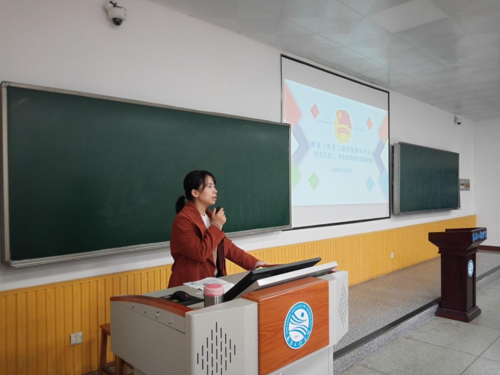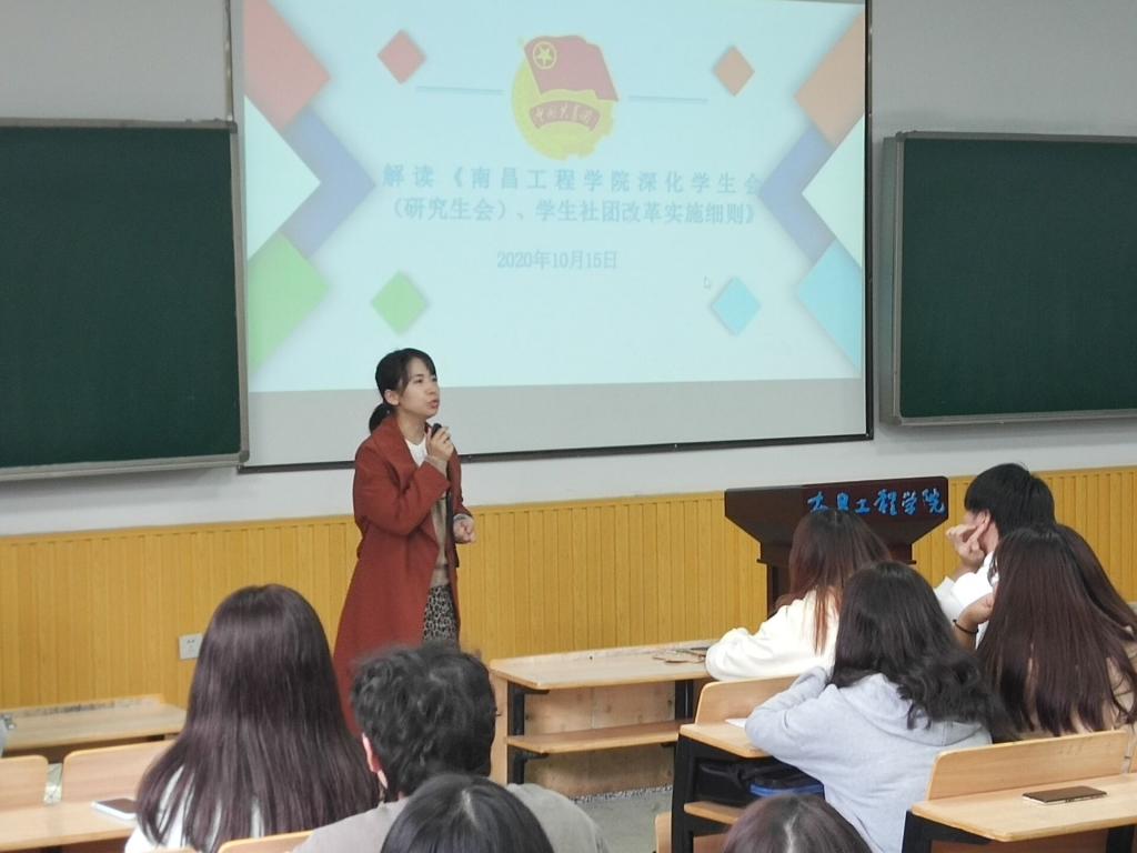 丁老师对《南昌工程公司深化员工会(研究生会)、员工社团改革实施细则》进行解读。首先详细介绍了本次员工会改革的政策依据,也简单介绍了中共教育部党组、共青团中央《高校员工社团建设管理办法》和公司内出台的一些政策文件。随后从强化党的领导、改革运行机制、精简组织机构、提升员工干部标准等七个方面对这些政策文件进行详细解读。