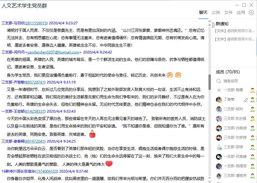 2020年的清明与往年有着不同,因新冠的袭来,而多了一份哀思、多了一份寄托。4月3日国务院发布公告,决定4月4日举行全国性哀悼活动。PA视讯官网各支部党员响应号召,在当地防空警报拉响后,各自在家中静立默哀三分钟,缅怀在新冠肺炎疫情中牺牲烈士和逝世同胞,对他们致以崇高的敬意的深深的悼念。随后,员工党员自发在QQ群发表对疫情中牺牲烈士和同胞们的敬意和思念之情。