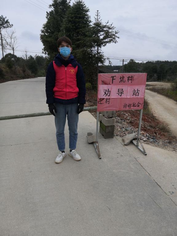 回到老家后,来自18级产品设计的温生威一直关注着疫情的发展。不久后江西省启动一级响应,村子里面开始封路,温生威作为入党积极分子,他积极响应党员冲在前的号召,报名了村里的防疫志愿者工作。他和其他党员干部一起在入村口的检查站岗,对外来人员进行拦截和劝返,本地人员出入必须进行体温测量。村中老人多,如何让老人意识病毒的严重性很重要。另外,一些志愿者给村里捐赠了一万个医用口罩,他自觉肩负起派发口罩的工作,并教导老人们如何佩戴口罩。温生威以另一种方式对抗着疫情,为疫情防控贡献着自己的力量,大事难事显担当,危难时刻现本色。他在战“疫”时刻奉献的光和热,都凝聚成了一股坚守无畏的伟大力量。