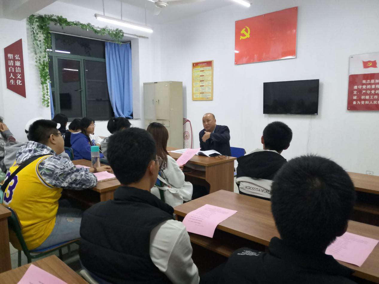 课程伊始,书记熊华林向新生提出“要积极接受新知识,了解新思想,追求进步”的要求,并引用“暮夜无知”的成语故事,进一步举例引申出党员“廉洁、廉明、廉政”的三方面问题,提出争做合格党员必须以高层次的标准来约束自己,守住底线,不踩红线。