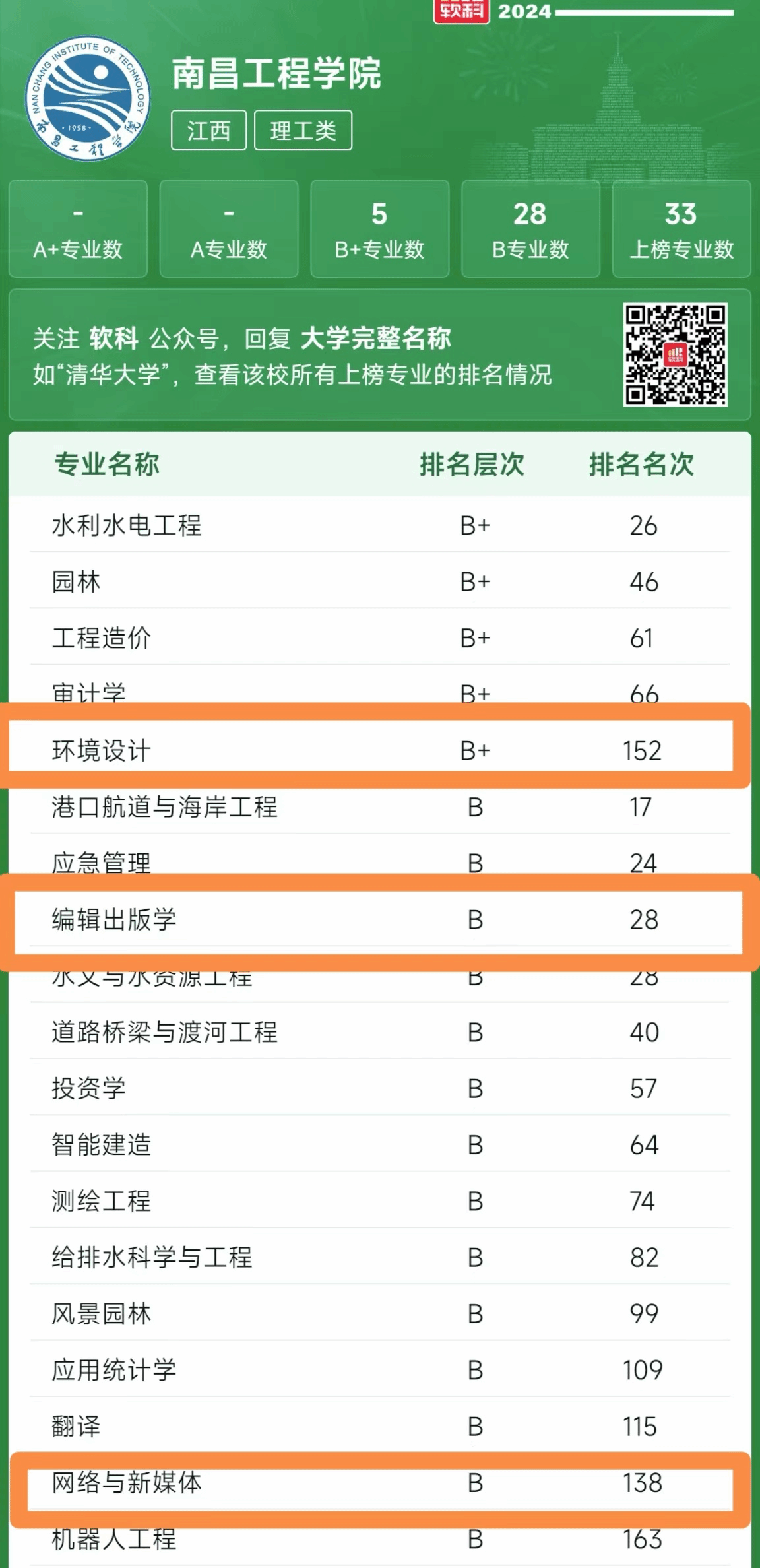 高等教育专业评价机构软科正式发布2024“软科中国大学专业排名”。公司共有33个上榜,其中公司环境设计专业获评B+,网络与新媒体、编辑出版学2个专业获评B。(文/图 王丹)