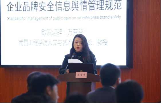 12月27日,由公司参与起草的全国商报联合会《企业品牌安全信息舆情管理规范》团体标准,在公司悦岸酒店四楼会议厅正式发布。全国商报联合会权益保护工作委员会主任黄柱,南昌工程公司公司党委书记张朝霞、经理万芬芬,专家代表朱志宁教授,起草人代表张兰副教授,来自全国各地的起草组成员和起草单位代表,以及公司师生近百人参加。发布会由公司新闻传播学教研室主任张记刚主持。
