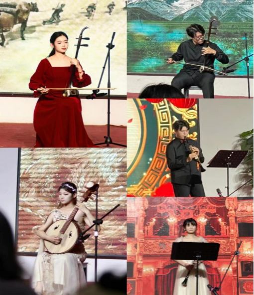 李海博等15位同学带来的古筝、二胡、单簧管、中阮独奏为第一场音乐会带来了深情厚意的演绎,犹如一幅绚烂的音乐画卷,弦乐器的柔和旋律与鼓乐器的激情节奏交织在一起,仿佛在诉说着音乐的故事。