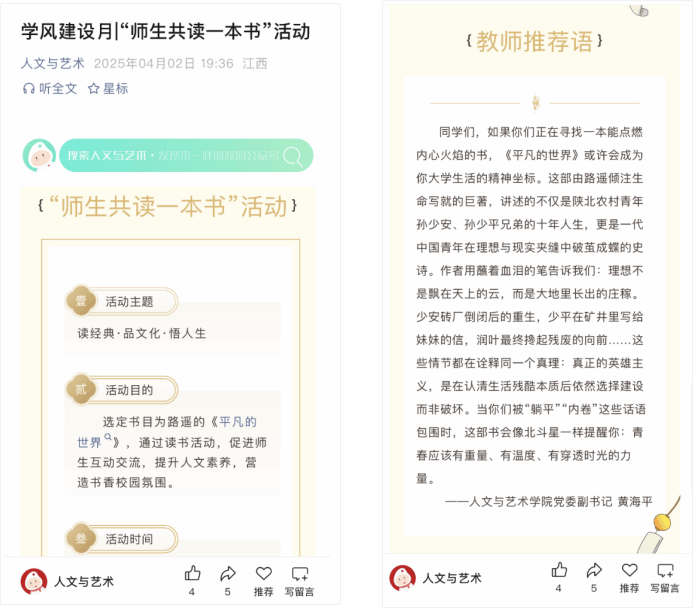 活动初期,公司通过微信公众号发布专题推文,详细介绍《平凡的世界》的基本信息和文学价值,并制定了21天阅读打卡计划。师生们积极响应,在活动微信群中分享阅读进度、摘抄经典段落,累计提交200余篇读书笔记。许多同学在活动小程序留言中表达感悟,其中23级产品设计专业齐晨祥写道:“孙少平在矿井下坚持读书的场景让我深受触动,艺术创作也需要这样的精神力量。”