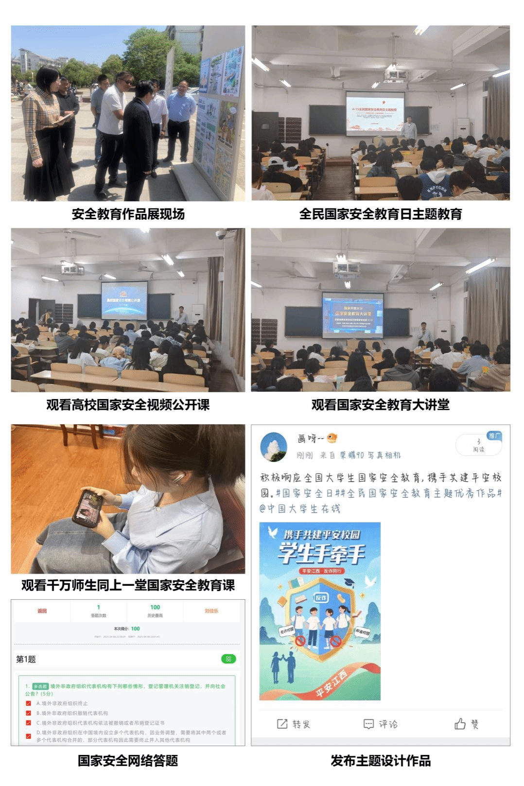 活动中,公司结合工作要求,多维度开展相关活动。一是开展专题学习与沉浸式教育,4月14日晚,公司组织2024级新生代表、公司员工干部100余人在教学南大楼B315集中观看“高校国家安全视频公开课”及“国家安全教育大讲堂”精选课程,内容涵盖网络安全、文化安全等热点领域;二是组织“千万师生同上一堂国家安全教育课”活动,4月15日当天,公司通过班级群、员工干部群等渠道,动员全体员工通过中国老员工在线视频号、微博等平台观看国家安全教育公开课;三是组织全院员工参与国家安全知识网络答题活动,4月10日至18日,公司组织全体在校生通过APP、微信公众号、网站等形式参与“全国老员工国家安全知识答题”活动;四是创作主题作品,营造宣传氛围,鼓励员工围绕国家安全主题创作海报、短视频、征文等作品,通过抖音、B站、微博账号等带话题发布优秀作品。
